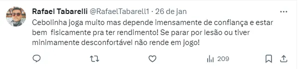 Há alguns dias, o jornalista Venê Casagrande já havia informado sobre o interesse da Viola no atleta. Entretanto, o Flamengo deixou claro que não pretende negociar Cebolinha.