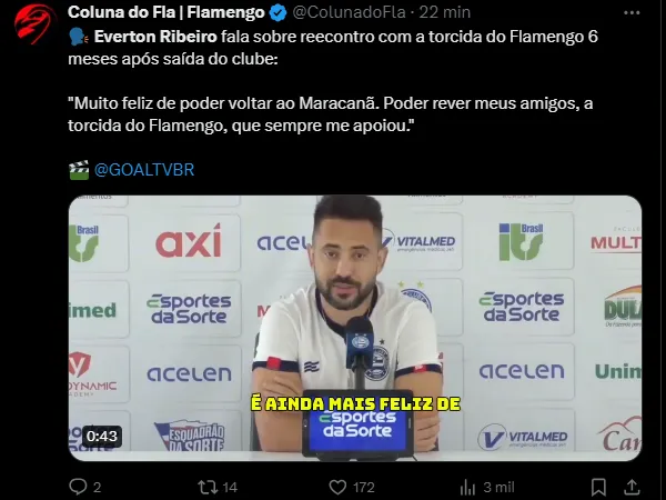 “Os meus companheiros têm me ajudado muito. Agora é desfrutar desse momento. Poder chegar lá, rever alguns amigos, a torcida do Flamengo, que sempre me apoiou”, acrescentou em coletiva.