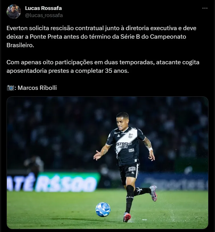 “Everton solicita rescisão contratual junto à diretoria executiva e deve deixar a Ponte Preta antes do término da Série B do Campeonato Brasileiro. Com apenas oito participações em duas temporadas, atacante cogita aposentadoria prestes a completar 35 anos.”- revelou o jornalista.