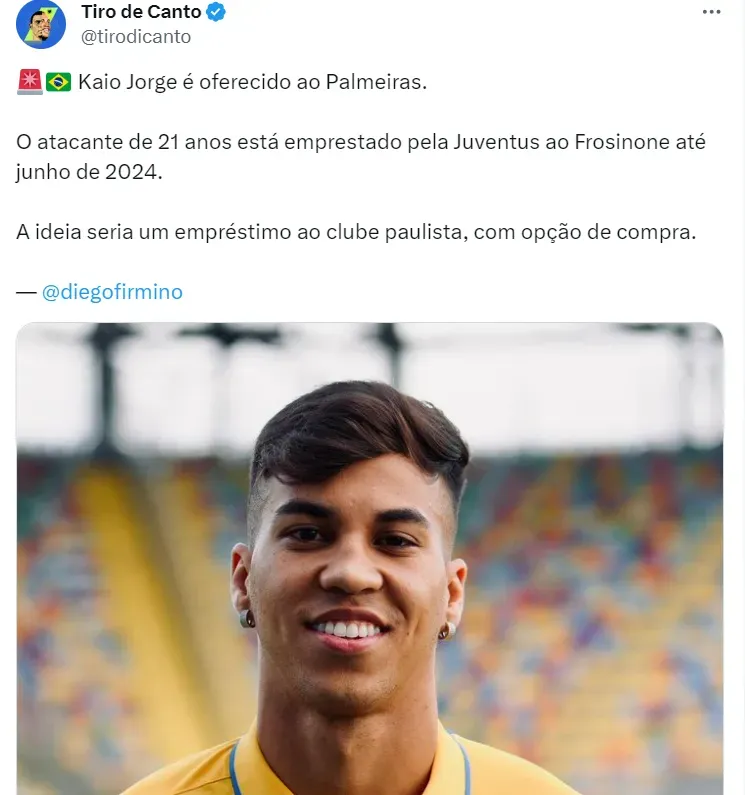 Todavia, Kaio Jorge pode deixar o Frosinone para voltar ao futebol brasileiro. Isso porque, de acordo com informações de Diego Firmino, setorista do Palmeiras, o jovem de 21 anos foi oferecido ao Verdão.