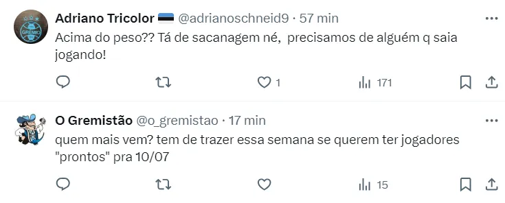 Dentro do Grêmio, há pressa por novas contratações, especialmente por um novo camisa 9, em meio à grande lesão sofrida por Diego Costa. A ideia é ter um novo atacante para as disputas das oitavas de final da Libertadores.