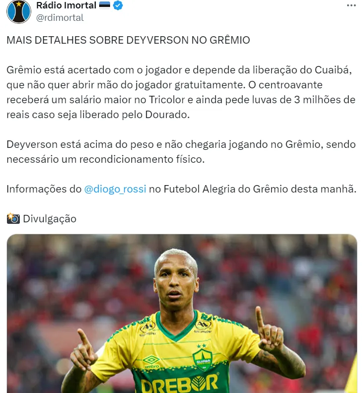 O acordo total ainda depende do Cuiabá. Segundo Diogo Rossi, do Donos da Bola RS, o Auriverde deseja uma compensação financeira para liberar o atacante. Feito isso, Deyverson será jogador gremista.