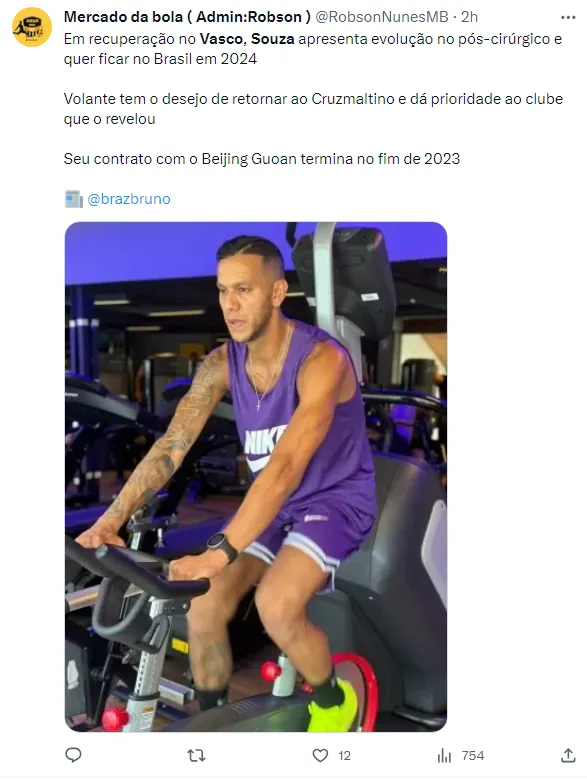 Apesar de seu valor de mercado atual ser estimado em 1,5 milhão de euros, de acordo com o ‘Transfermarkt’, Souza poderia voltar ao Vasco sem custos, já que seu contrato com o Beijing Guon está próximo de se encerrar no final deste ano.