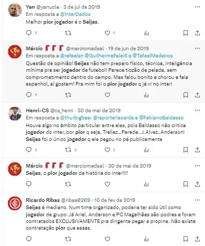 Em resposta a um internauta que sugeriu, de forma bem-humorada, a contratação de Seijas, Baldasso foi direto ao afirmar que o jogador foi o pior atleta da história do Internacional.