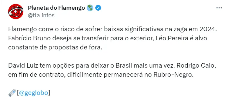 Para 2024, em uma nova temporada do futebol brasileiro, é informado que Fabrício Bruno deseja enfrentar um novo desafio em um possível novo clube, o que poderia resultar na perda do Flamengo de seu grande defensor.