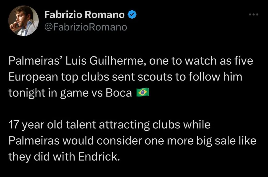 Segundo informações do jornalista Fabrizio Romano, o Palmeiras pode perder Luis Guilherme em breve. O atacante está sendo monitorado por 5 times do Futebol Europeu.