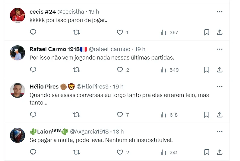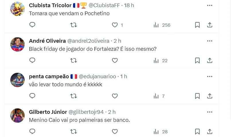 “Alguns jogadores já estão sendo negociados. Podem negar, mas as negociações estão acontecendo. Uma delas é o Caio Alexandre, o Palmeiras está tentando comprar parte dos direitos que o Fortaleza tem a pagar ao Vancouver para ter a maioria e aí deixar parte com o Fortaleza. Essa é uma história que está acontecendo”, disse.