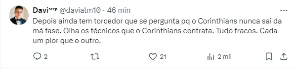 Porém, na web, a torcida do Corinthians não gostou nada do notícia. A grande maioria aparece contra a chegada do técnico campeão mundial com a Seleção Brasileira em 2002.