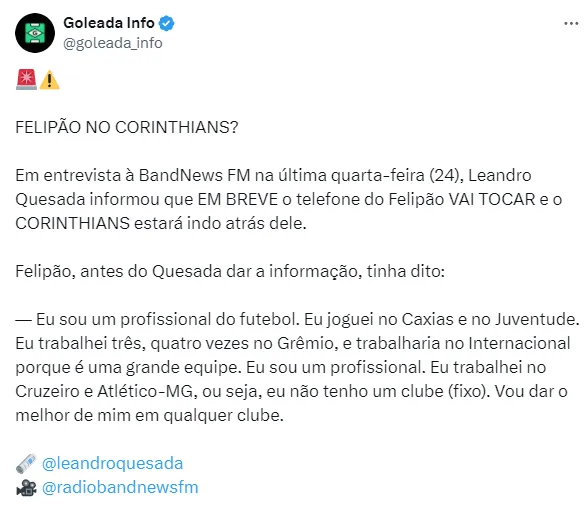 Na BandNews FM, o jornalista Leandro Quesada informou que o telefone de Felipão irá tocar em breve. Ou seja, o Corinthians deve ir atrás do veterano em caso de uma mudança no comando técnico.
