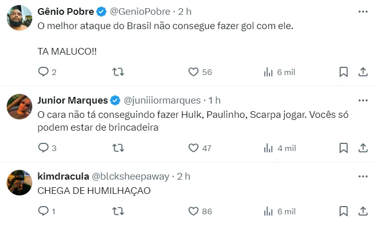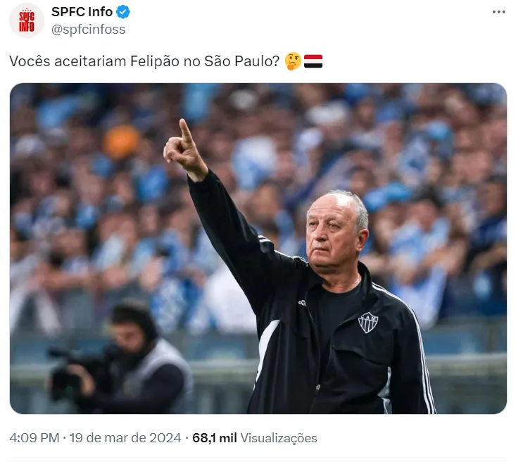Nas redes sociais, um perfil do São Paulo sugeriu o nome de Felipão para o comando do Tricolor. O time do Morumbi também não vive bom momento e Carpini sofre pressão para ser demitido.