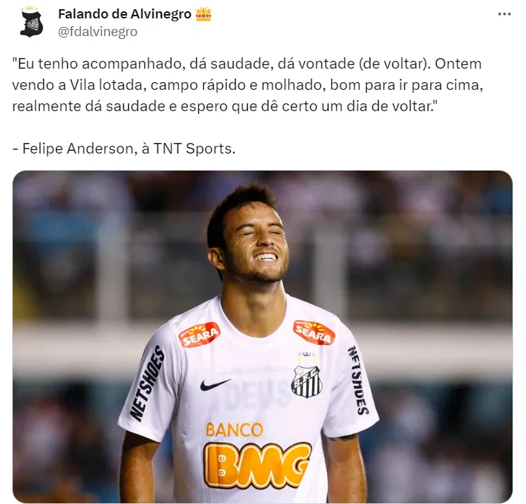 Em uma entrevista para a TNT Sports, Felipe Anderson abriu o jogo e comentou sobre a possibilidade de voltar ao Santos, clube que o revelou para o futebol e onde ele viveu um grande auge na carreira. Confira o que disse a grande cria santista, que pode retornar ao Peixão ao final da temporada europeia, a custo zero.