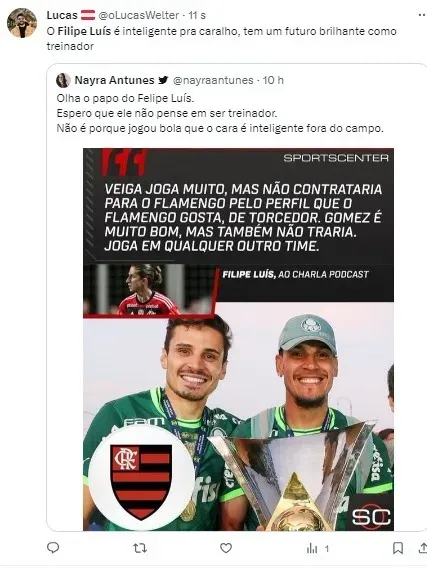 “Veiga joga muito, mas não traria pro Flamengo. O perfil que o Flamengo gosta, o torcedor e tal… Gómez é muito bom, mas eu não traria pro Flamengo, mas joga em qualquer outro time. Gosto mais do Murilo.”, disse.
