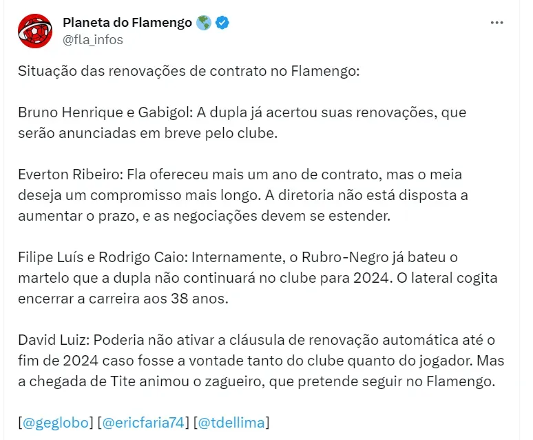 Além de Rodrigo Caio e Filipe Luís, o Flamengo pode enfrentar mais saídas no final da temporada, incluindo Everton Ribeiro e Pablo, cujos contratos estão se encerrando, e David Luiz, que tem perdido espaço na equipe.