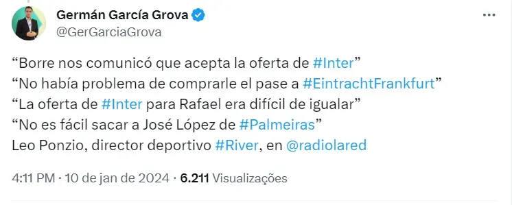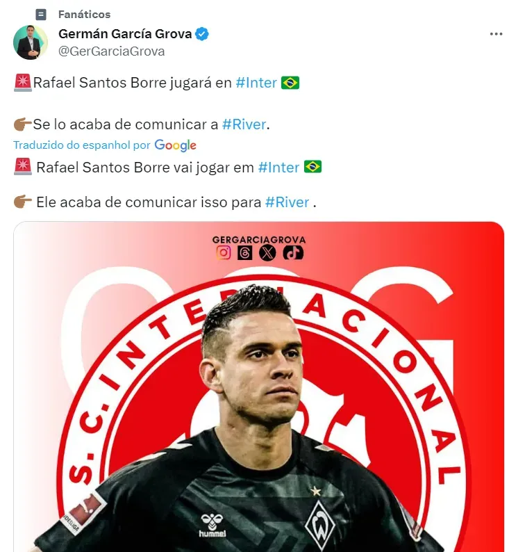 De acordo com Germán García Grova, Borré é o novo reforço do Internacional. O clube Colorado venceu a concorrência e será o destino do atacante neste ano.