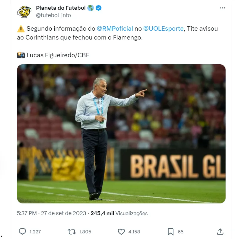 De acordo com informações do portal, Tite é o novo treinador do Flamengo. Apesar do Corinthians demonstrar grande interesse no trabalho de seu ex-treinador, Tite informou ao Timão que fechou acordo com o Flamengo para a temporada 2023-24.