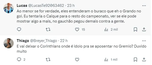 Além disso, o jornalista também conta que o goleiro manifestou desejo de deixar o Corinthians já em dezembro, apesar de ainda ter um ano de contrato. Atrasos de pagamentos seria um dos motivos.