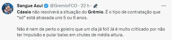 Desta forma, a ideia é de que haja uma rescisão. O Grêmio, inclusive, não está disposto a pagar pelo goleiro e só irá investir caso Cássio consiga ficar livre no mercado.