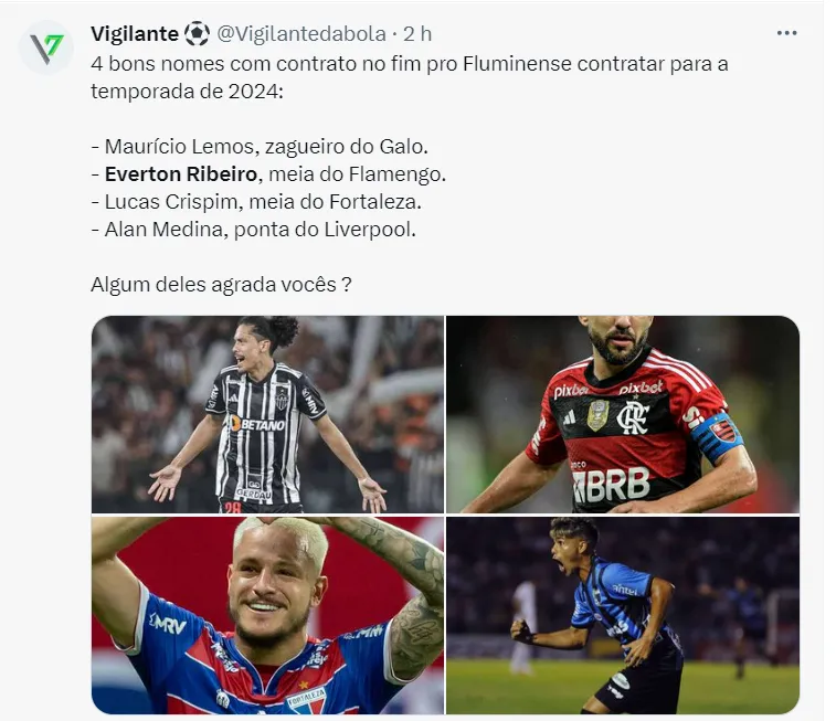 Segundo a fonte, o Fluminense avançou para contar com Everton Ribeiro em 2024. Após o pedido de Fernando Diniz, o Tricolor Carioca intensificou as conversas para ter o meia no elenco.