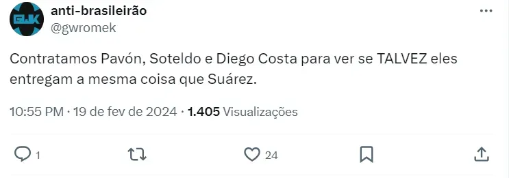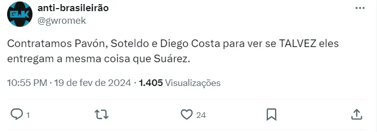 “Contratamos Pavón, Soteldo e Diego Costa para ver se talvez eles entregam a mesma coisa que Suárez”, disse um torcedor em uma publicação que cita as qualidades do ex-camisa 9.