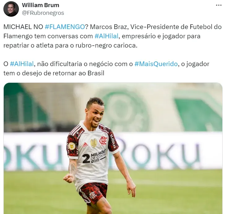 Visando a janela do meio do ano do futebol brasileiro, o Flamengo estaria negociando o retorno do atacante Michael, de 28 anos de idade, atualmente vestindo as cores do Al-Hilal, do futebol saudita.