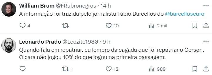 A informação é passada por William Brum e Fábio Barcellos. De acordo com eles, Marcos Braz, vice-presidente do Flamengo, tem conversas com o clube saudita e também com o empresário do atleta.