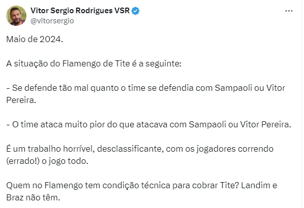 Com isso, a situação de Tite vem se complicando. Muitos torcedores, inclusive, já pedem a saída do treinador, que chegou ao clube carioca já ao fim da última temporada.