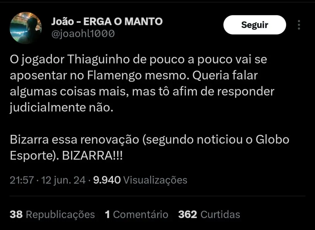O GE informa que o Flamengo está muito próximo de acertar a renovação de contrato do ponta-direita Thiaguinho.