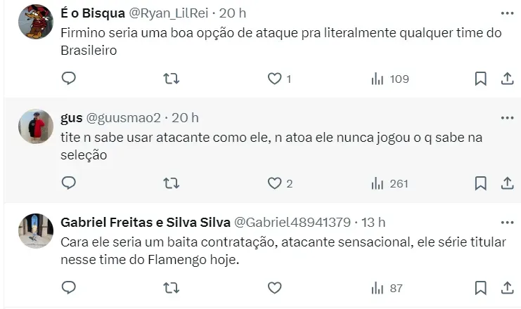 Firmino é de super conhecimento do técnico Tite, que o convocou em várias oportunidades para defender a Seleção Brasileira. No entanto, vale frisar que o camisa 10 não tem características que Tite aparenta gostar, fator que pode pesar contra na tentativa definitiva do clube carioca no meio do ano.
