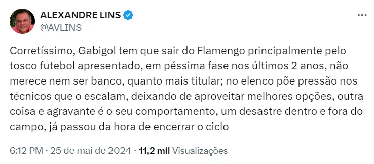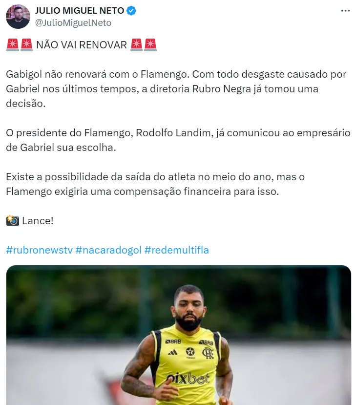 O Flamengo decidiu que não vai renovar o contrato de Gabigol, segundo informações de Julio Miguel Neto, que informou sobre a decisão em conta oficial na plataforma X.