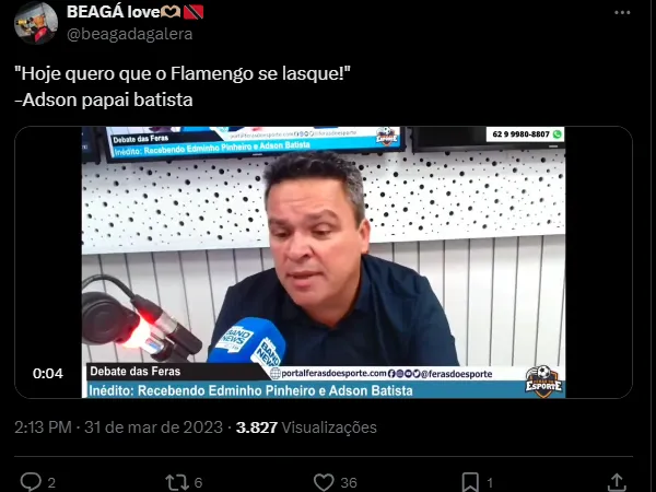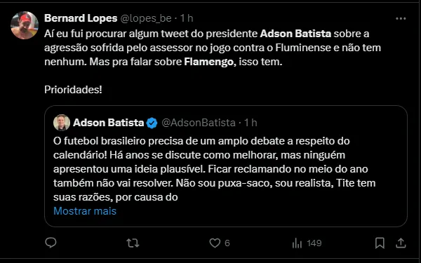 O presidente do Atético-GO, Adson Batista, não concordou com as últimas declarações do técnico Tite, do Flamengo. Após a vitória sobre o Bahia, o treinador mandou recados.