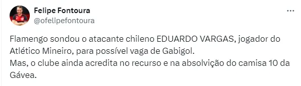 A ideia seria para ser uma reposição a Gabigol, que ficará suspenso por um bom período. Porém, conforme apurado pelo RTI Esporte, o nome de Vargas, neste momento, não está nos planos do Fla.