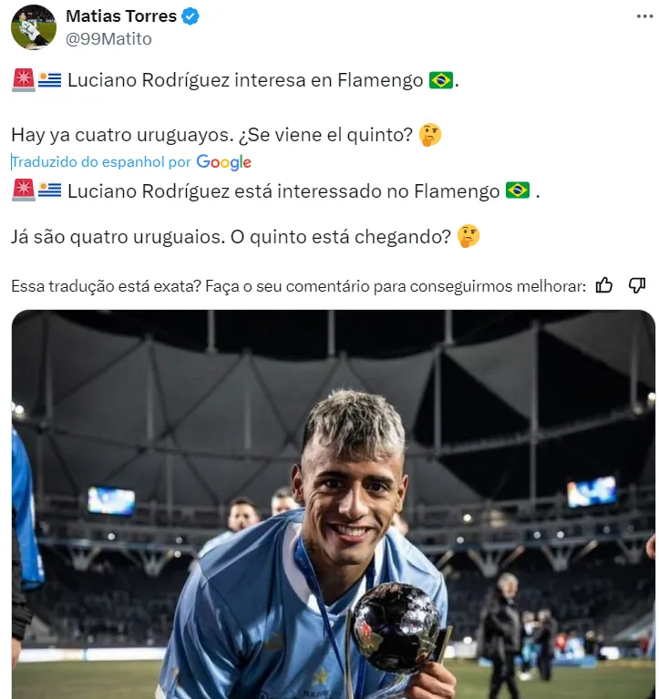 De acordo com Matias Torres, o Flamengo está interessado em Luciano Rodríguez. A fonte não entra em maiores informações, mas frisa que o Mengão já tem quatro uruguaios no elenco.