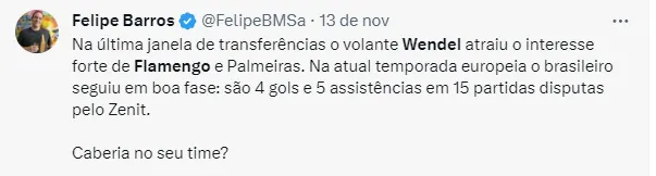 Vale ressaltar que Wendel já esteve muito perto de fechar com o Mais Querido nesta última janela de transferências. Entretanto, o clube não conseguiu um acordo com o Zenit.