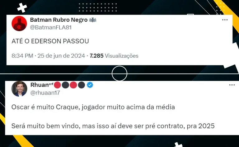 “Oscar será jogador do Flamengo, só não assina se não for aprovado nos exames médicos, mas relaxa que nesse até o Conca passou”, disse. “Questão de tempo, desejo dele é muito grande, se não nessa janela, na próxima não escapa”, completa André.
