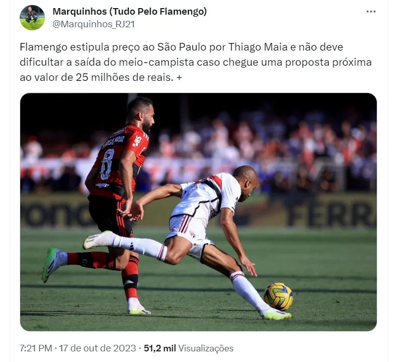 No entanto, parece que o ciclo de Thiago Maia no Rio de Janeiro pode estar chegando ao fim. Embora ele tenha contrato com o gigante carioca por mais alguns anos, há informações de que o Flamengo está disposto a negociá-lo com o São Paulo.