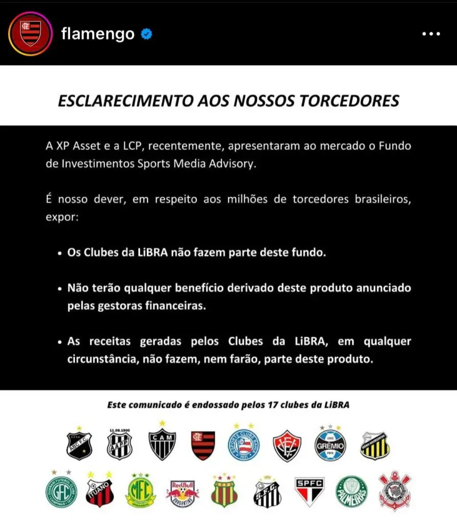Em suas redes sociais, o Flamengo e outros clubes da Libra deram declarações envolvendo um possível investimento das empresas XP Asset e LCP. Gigantes do Futebol Brasileiro fazem parte da Libra, entre eles, estão Flamengo, Palmeiras, Corinthians, São Paulo e Grêmio.