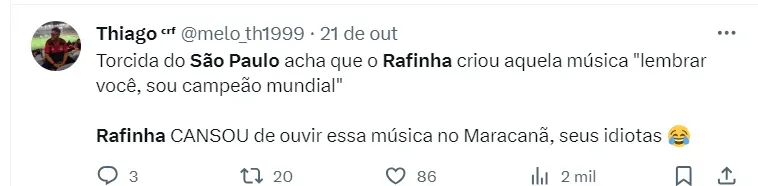 Torcedor do São Paulo de coração, Rafinha já apontou que o gigante paulista é o maior clube de futebol do Brasil, apesar de sua boa passagem pelo Flamengo, clube que foi campeão da Libertadores.