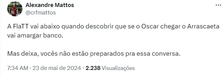 Oscar é a grande prioridade do Flamengo para reforçar o sistema de meio-campo do time de Tite, já que se trata de um jogador de alto nível que encontra-se de saída do futebol chinês no final de 2024.