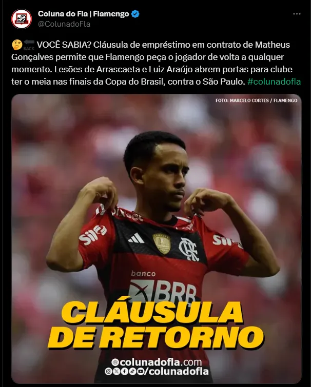 De acordo com as informações publicadas pelo portal “Coluna do Fla”, o Flamengo colocou uma cláusula no empréstimo de Matheus Gonçalves ao RB Bragantino que permite o retorno do atleta a qualquer momento.