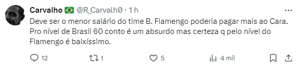 Porém, o que chamou a atenção da Nação, é o salário do atleta. Ainda de acordo com a publicação, Carlinhos terá vencimentos na casa de R$ 60 mil por mês. Um dos menores do clube.