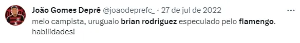 Isso porque, conforme repercutido pelo jornalista Fabrício Lopes, o atacante Brian Rodríguez, que está com 23 anos de idade, foi oferecido ao Rubro-Negro carioca nos últimos dias.