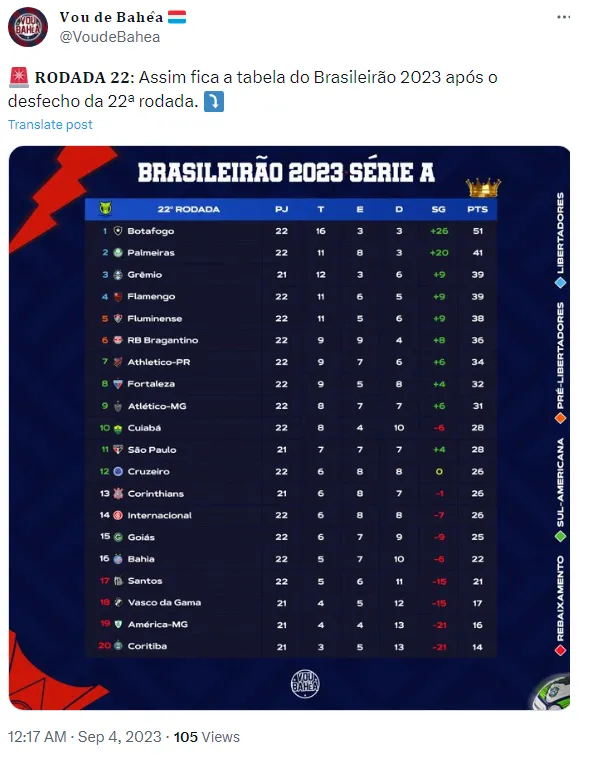 Confira a tabela do Brasileirão 2023