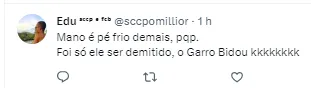 “Mano é pé frio demais, pq*. Foi só ele ser demitido, o Garro Bidou kk”, “Minha nossa senhora, o impossível aconteceu!”, “Até que enfim, uma notícia boa!”, “Finalmente”, “Todas as minhas esperanças estão nele, tomara que carregue a gente”, “Até que enfim, agora vai”, “Estava sonhando com esse dia”, “