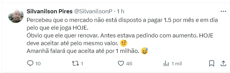 A situação do ídolo flamenguista é de um contrato que vai até dezembro de 2024 e, neste momento, a tendência é que o Flamengo não renove com atleta, após o mesmo ser flagrado vestindo a camisa do Corinthians.