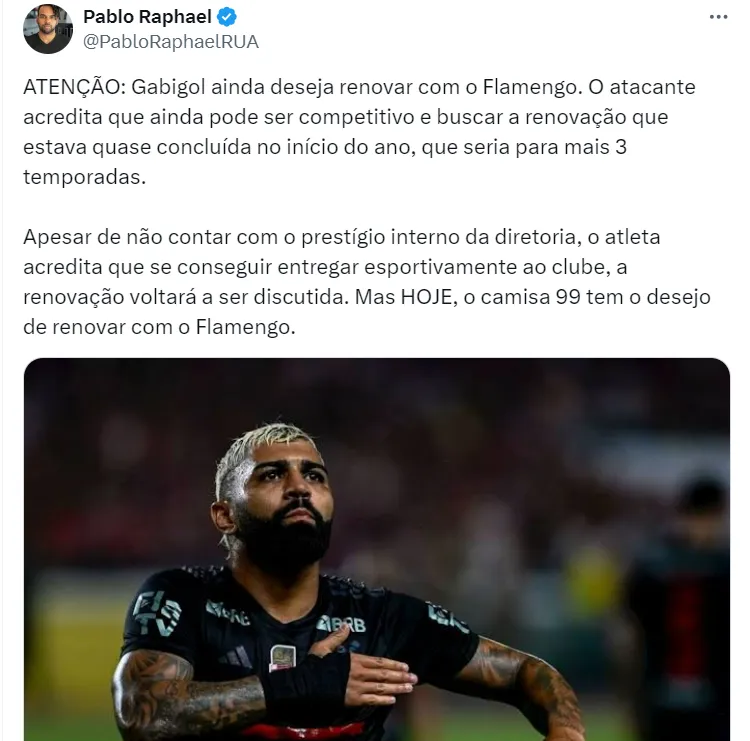 Apesar da posição clara e bastante rigorosa do Flamengo, Gabigol quer permanecer no Rio e tem o desejo de renovar seu contrato em 2025, mesmo diante da possibilidade de defender outro time da elite do Brasil. Foi o que revelou em seu Twitter o jornalista Pablo Raphael, do Gazeta do Urubu PT e da BTB Sports.