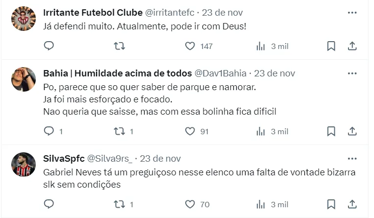 Sem espaço, Gabriel Neves pode trocar o São Paulo para jogar com as cores do Santos em 2024, de acordo com Alexsander Vieira. A fonte informa que o Peixe tentou o atleta em oportunidades anteriores, e o mesmo pode ganhar força para 2024.