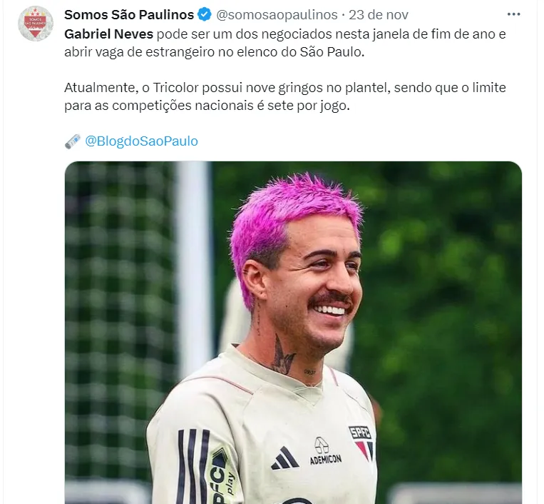 O meia Gabriel Neves encontra-se sem espaço com o técnico Dorival Jr e pode deixar o São Paulo ao final da temporada do futebol brasileiro. O destino, segundo fontes, pode ser um rival do Tricolor.
