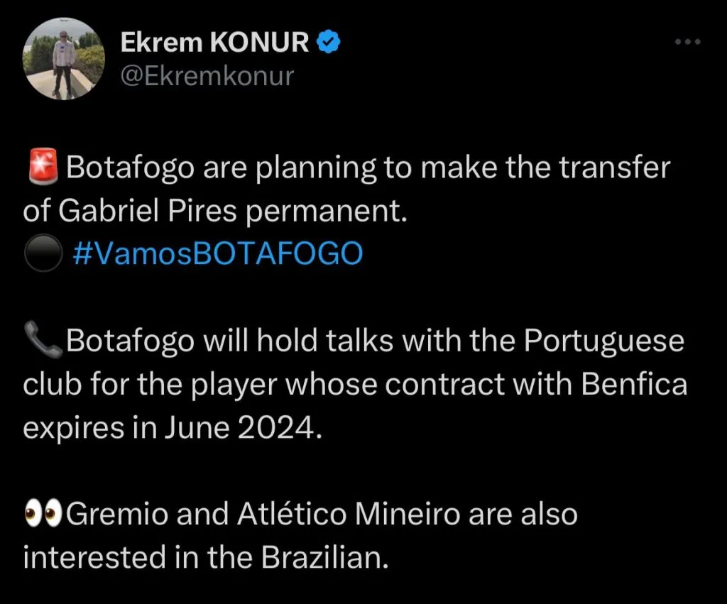 Segundo informações do jornalista Ekrem Konur, Grêmio e Atlético-MG são dois dos principais interessados na contratação de Gabriel Pires, emprestado ao Botafogo pelo Benfica.