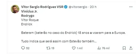 “Queria parabenizar nossos meninos de ouro! Vinicius Junior e Rodrygo! Campeões do Espanhol com o Real Madrid com 4 rodadas de antecedência! Mais uma grande conquista para nossos dois maiores craques da Seleção! Espetacular!”, elogiou Galvão Bueno.