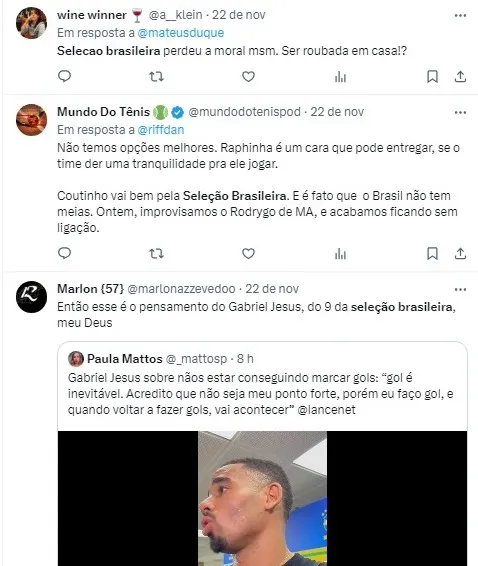“Não sei porque o Gabriel Jesus é titular da seleção até hoje. Não sei como jogamos com laterais tão ruins, trocou o lateral-esquerdo, não adianta nada, sai um entra outro, continua o mesmo na direita… não temos laterais em um futebol dos maiores laterais da história do futebol mundial”, disparou Galvão.